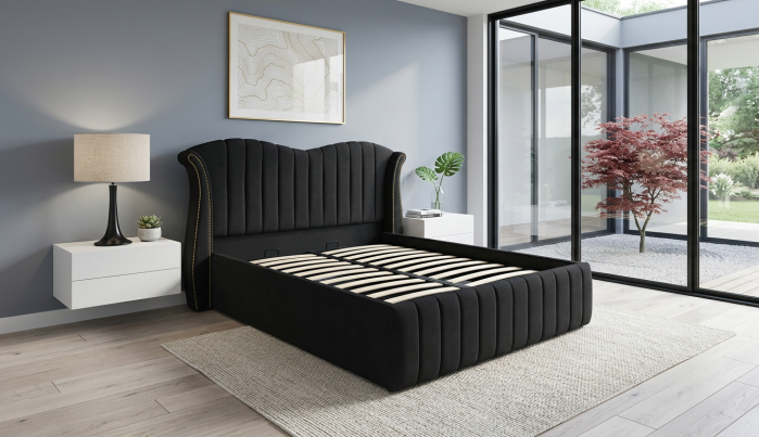 Structura patului este formata din lemn si pal melaminat. Aceasta este acoperita cu spuma poliuretanica in grosime de 50 mm si vatelina, urmata de stratul final reprezentat de o catifea fina si, totodata, usor de intretinut. Tablia patului are o forma neregulata, cu linii drepte paralele, pentru un aspect modern al patului. Somiera metalica rabatabila este fixata pe lateralele dublate ale patului in grosime de 40 mm, dobandind astfel o rezistenta crescuta in timp. Somiera rabatabila ofera numeroase avantaje: se poate folosi spatiul pentru depozitare, ajuta salteaua sa respire prevenind formarea mucegaiului si a mirosurilor neplacute, ofera o mai buna sustinere a saltelei.