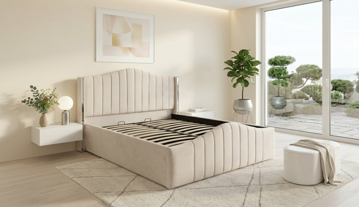 Structura patului este formata din lemn si pal melaminat. Aceasta este acoperita cu spuma poliuretanica in grosime de 50 mm si vatelina, urmata de stratul final reprezentat de o catifea fina si, totodata, usor de intretinut.Tablia patului este incadrata de doua linii argintii aplicate pe lateralele tabliei mari pentru un aspect modern al patului. Somiera metalica rabatabila este fixata pe lateralele dublate ale patului in grosime de 40 mm, dobandind astfel o rezistenta crescuta in timp. Somiera rabatabila ofera numeroase avantaje: se poate folosi spatiul pentru depozitare, ajuta salteaua sa respire prevenind formarea mucegaiului si a mirosurilor neplacute, ofera o mai buna sustinere a saltelei.