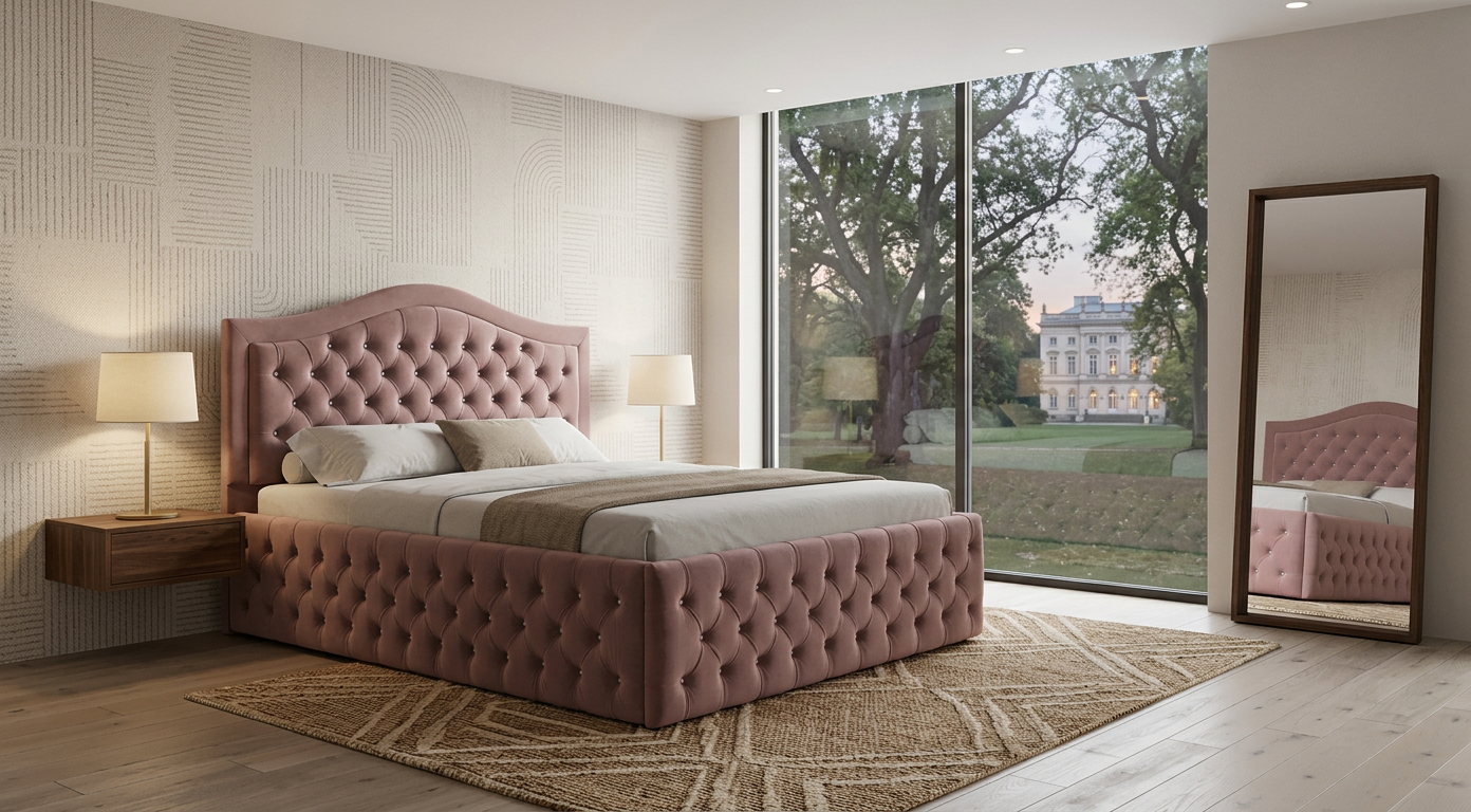 Structura patului este formata din lemn si pal melaminat. Aceasta este acoperita cu spuma poliuretanica in grosime de 50 mm si vatelina, urmata de stratul final reprezentat de o catifea fina si, totodata, usor de intretinut. Tablia patului este tapitata in stil chesterfield, cu nasturi tapitati. Somiera metalica rabatabila este fixata pe lateralele dublate ale patului in grosime de 40 mm, dobandind astfel o rezistenta crescuta in timp. Somiera rabatabila ofera numeroase avantaje: se poate folosi spatiul pentru depozitare, ajuta salteaua sa respire prevenind formarea mucegaiului si a mirosurilor neplacute, ofera o mai buna sustinere a saltelei.