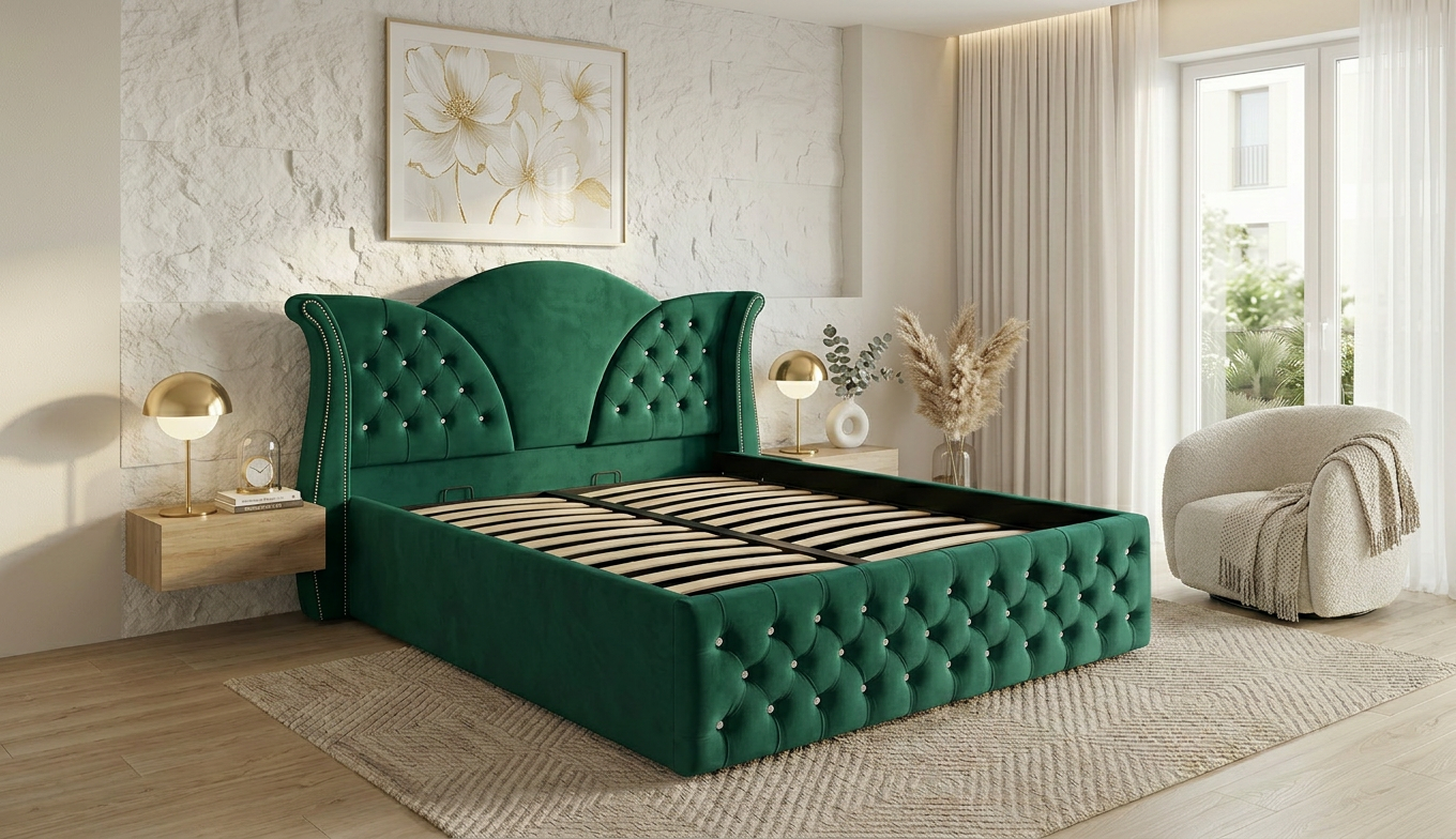 Structura patului este formata din lemn si pal melaminat. Aceasta este acoperita cu spuma poliuretanica in grosime de 50 mm si vatelina, urmata de stratul final reprezentat de o catifea fina si, totodata, usor de intretinut. Tablia patului este tapitata in stil chesterfield, cu nasturi tapitati. Somiera metalica rabatabila este fixata pe lateralele dublate ale patului in grosime de 40 mm, dobandind astfel o rezistenta crescuta in timp. Somiera rabatabila ofera numeroase avantaje: se poate folosi spatiul pentru depozitare, ajuta salteaua sa respire prevenind formarea mucegaiului si a mirosurilor neplacute, ofera o mai buna sustinere a saltelei.