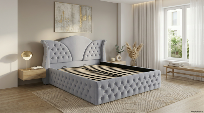 Structura patului este formata din lemn si pal melaminat. Aceasta este acoperita cu spuma poliuretanica in grosime de 50 mm si vatelina, urmata de stratul final reprezentat de o catifea fina si, totodata, usor de intretinut. Tablia patului este tapitata in stil chesterfield, cu nasturi tapitati. Somiera metalica rabatabila este fixata pe lateralele dublate ale patului in grosime de 40 mm, dobandind astfel o rezistenta crescuta in timp. Somiera rabatabila ofera numeroase avantaje: se poate folosi spatiul pentru depozitare, ajuta salteaua sa respire prevenind formarea mucegaiului si a mirosurilor neplacute, ofera o mai buna sustinere a saltelei.