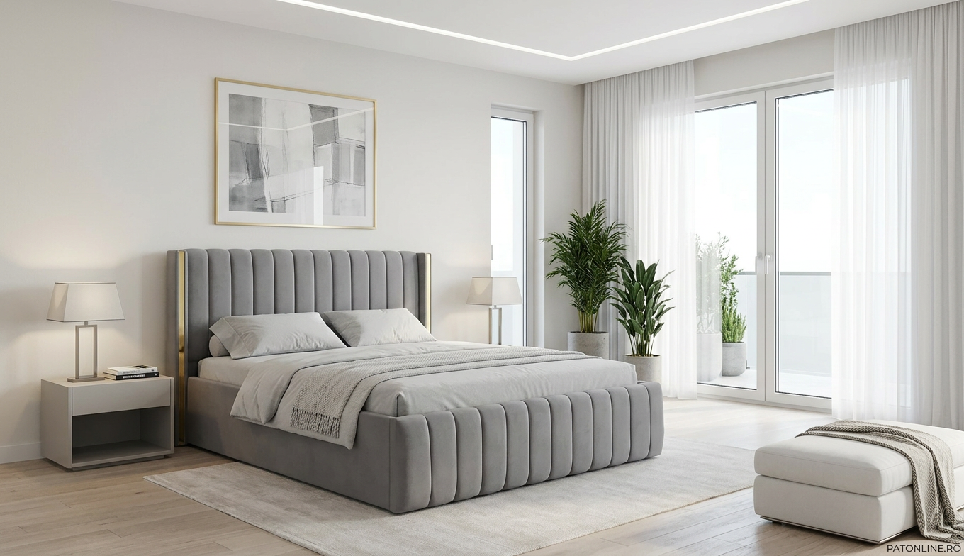 Structura patului este formata din lemn si pal melaminat. Aceasta este acoperita cu spuma poliuretanica in grosime de 50 mm si vatelina, urmata de stratul final reprezentat de o catifea fina si, totodata, usor de intretinut.Tablia patului este incadrata de doua linii aurii aplicate pe lateralele tabliei mari pentru un aspect modern al patului. Picioarele aurii vor completa desingul modern al patului, facand din acesta piesa de rezistenta a dormitorului. Somiera metalica rabatabila este fixata pe lateralele dublate ale patului in grosime de 40 mm, dobandind astfel o rezistenta crescuta in timp. Somiera rabatabila ofera numeroase avantaje: se poate folosi spatiul pentru depozitare, ajuta salteaua sa respire prevenind formarea mucegaiului si a mirosurilor neplacute, ofera o mai buna sustinere a saltelei.