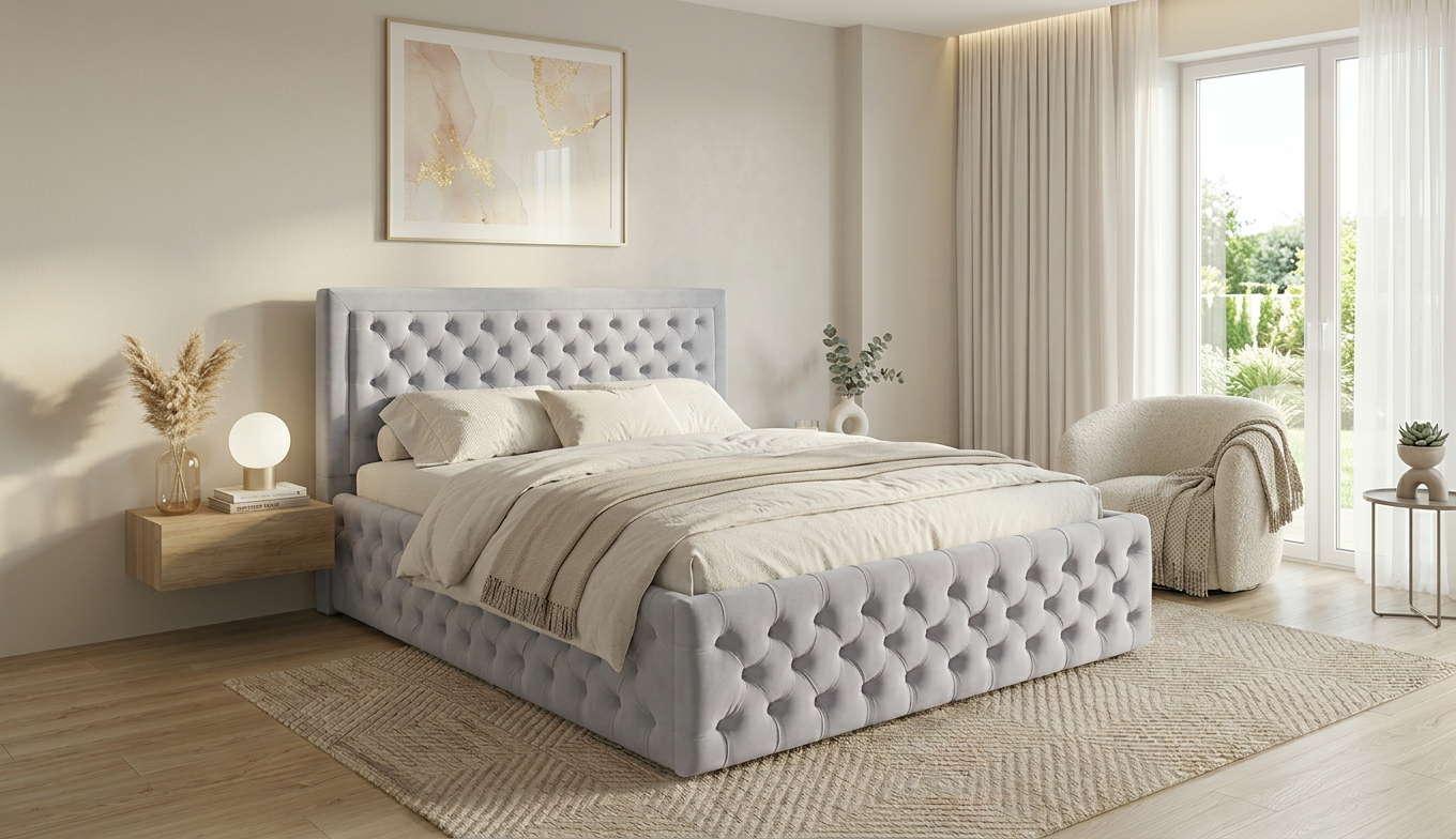 Structura patului este formata din lemn si pal melaminat. Aceasta este acoperita cu spuma poliuretanica in grosime de 50 mm si vatelina, urmata de stratul final reprezentat de o catifea fina si, totodata, usor de intretinut. Tablia patului este tapitata in stil chesterfield, cu nasturi tapitati. Somiera metalica rabatabila este fixata pe lateralele dublate ale patului in grosime de 40 mm, dobandind astfel o rezistenta crescuta in timp. Somiera rabatabila ofera numeroase avantaje: se poate folosi spatiul pentru depozitare, ajuta salteaua sa respire prevenind formarea mucegaiului si a mirosurilor neplacute, ofera o mai buna sustinere a saltelei.