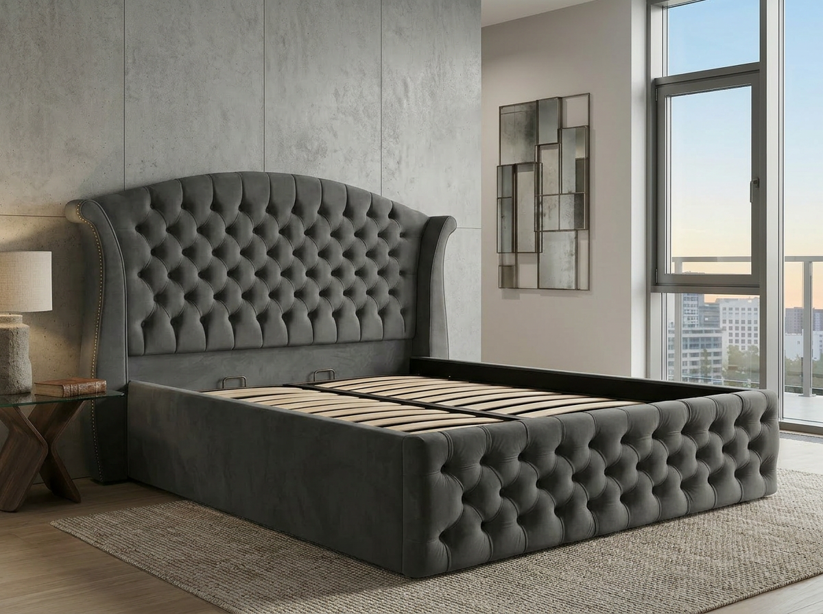 Structura patului este formata din lemn si pal melaminat. Aceasta este acoperita cu spuma poliuretanica in grosime de 50 mm si vatelina, urmata de stratul final reprezentat de o catifea fina si, totodata, usor de intretinut. Tablia patului este tapitata in stilul Chesterfield, cu nasturi imbracati in material la culoarea patului.