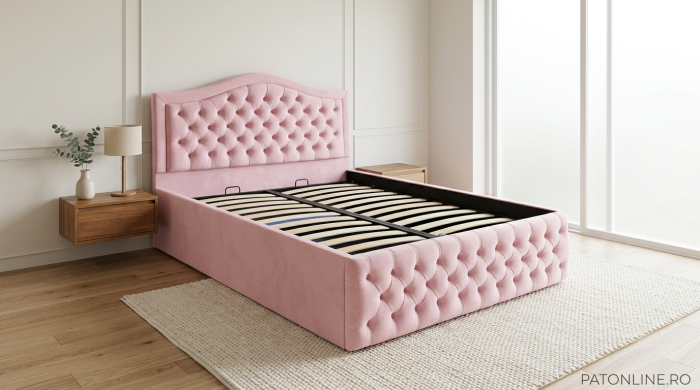 Structura patului este formata din lemn si pal melaminat. Aceasta este acoperita cu spuma poliuretanica in grosime de 50 mm si vatelina, urmata de stratul final reprezentat de o catifea fina si, totodata, usor de intretinut. Tablia patului este tapitata in stil chesterfield, cu nasturi tapitati. Somiera metalica rabatabila este fixata pe lateralele dublate ale patului in grosime de 40 mm, dobandind astfel o rezistenta crescuta in timp. Somiera rabatabila ofera numeroase avantaje: se poate folosi spatiul pentru depozitare, ajuta salteaua sa respire prevenind formarea mucegaiului si a mirosurilor neplacute, ofera o mai buna sustinere a saltelei.