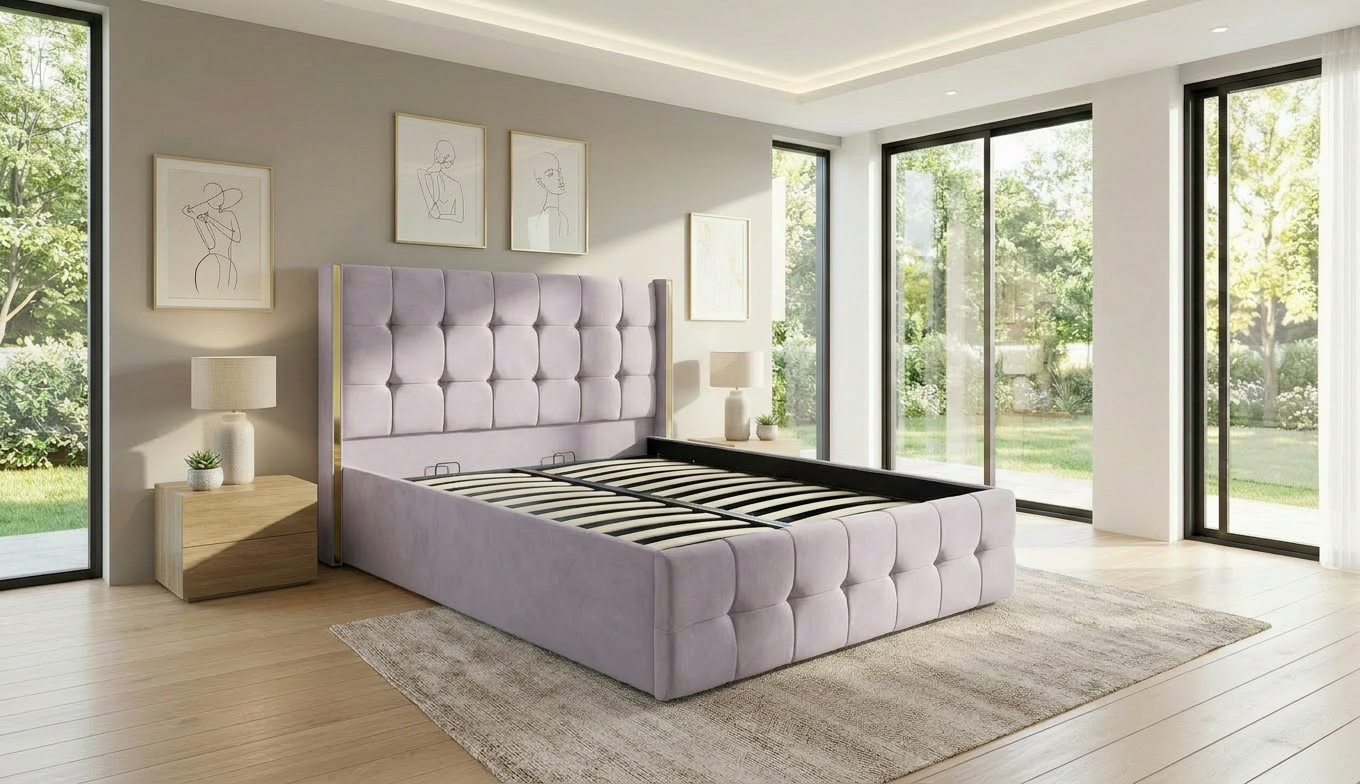 Structura patului este formata din lemn si pal melaminat. Aceasta este acoperita cu spuma poliuretanica in grosime de 50 mm si vatelina, urmata de stratul final reprezentat de o catifea fina si, totodata, usor de intretinut.Tablia patului este incadrata de doua linii aurii aplicate pe lateralele tabliei mari pentru un aspect modern al patului. Picioarele aurii vor completa desingul modern al patului, facand din acesta piesa de rezistenta a dormitorului. Somiera metalica rabatabila este fixata pe lateralele dublate ale patului in grosime de 40 mm, dobandind astfel o rezistenta crescuta in timp. Somiera rabatabila ofera numeroase avantaje: se poate folosi spatiul pentru depozitare, ajuta salteaua sa respire prevenind formarea mucegaiului si a mirosurilor neplacute, ofera o mai buna sustinere a saltelei.