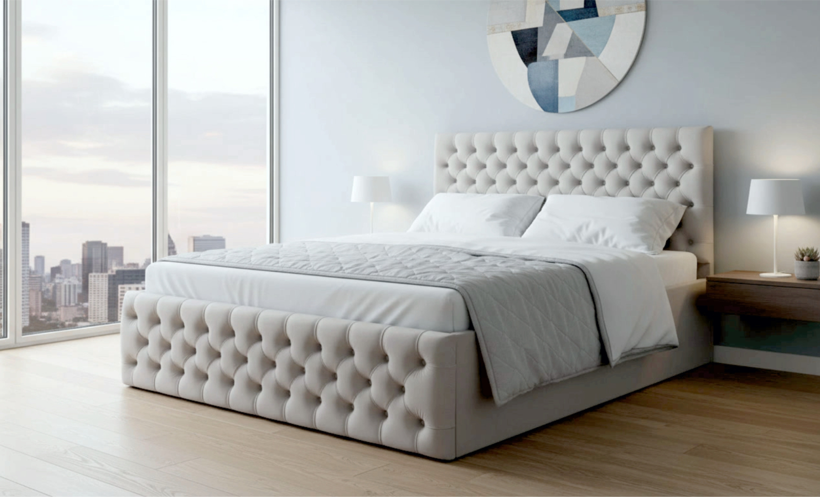 Structura patului este formata din lemn si pal melaminat. Aceasta este acoperita cu spuma poliuretanica in grosime de 50 mm si vatelina, urmata de stratul final reprezentat de o catifea fina si, totodata, usor de intretinut. Tablia patului este tapitata in stil chesterfield, cu nasturi tapitati. Somiera metalica rabatabila este fixata pe lateralele dublate ale patului in grosime de 40 mm, dobandind astfel o rezistenta crescuta in timp. Somiera rabatabila ofera numeroase avantaje: se poate folosi spatiul pentru depozitare, ajuta salteaua sa respire prevenind formarea mucegaiului si a mirosurilor neplacute, ofera o mai buna sustinere a saltelei.