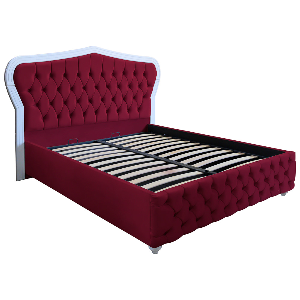 Pat dublu tapitat Egeea cu picioare, 160/200, visiniu, cu somiera metalica rabatabila si lada de depozitare